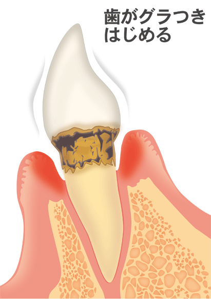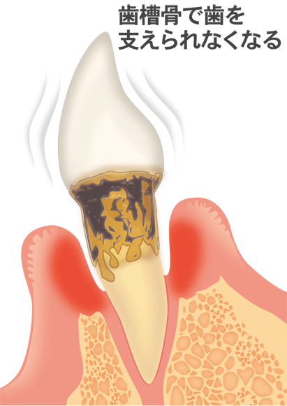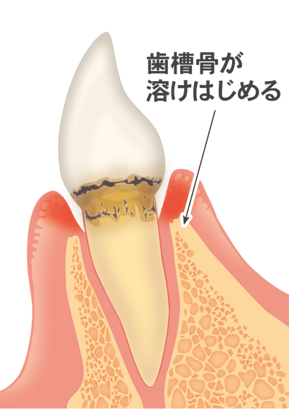 歯周病とは、細菌の感染によって引き起こされる炎症性疾患で、歯の周りの歯ぐき(歯肉)や、歯を支える骨などが溶けてしまう病気です。 歯と歯肉の境目(歯肉溝)の清掃が行き届かないでいると、そこに多くの細菌が停滞し歯肉の辺縁が炎症を起こして赤くなったり、腫れたりしますが痛みはほとんどの場合ありません。 さらに進行すると膿がでたり歯が動揺してきて、最後には歯を抜かなければならなくなってしまいます。 |